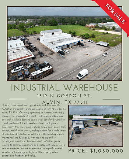 Unlock a rare investment opportunity with this versatile 4,000 SF industrial warehouse located at 1319 N Gordon St, Alvin, TX 77511. Currently operating as a restaurant supply business, this property offers both real estate and business potential in a high-demand commercial corridor. Situated on a well positioned lot with excellent street frontage and accessibility, this warehouse features ample open space, high ceilings, and drive-in access, making it ideal for a wide range of industrial, distribution, or retail uses. The building is well- maintained and functional, with room to expand or reconfigure to suit your business needs. Whether you're looking to continue operations as a restaurant supply, start a new commercial venture, or secure a strategically located warehouse for storage or logistics, this property offers outstanding flexibility and value.